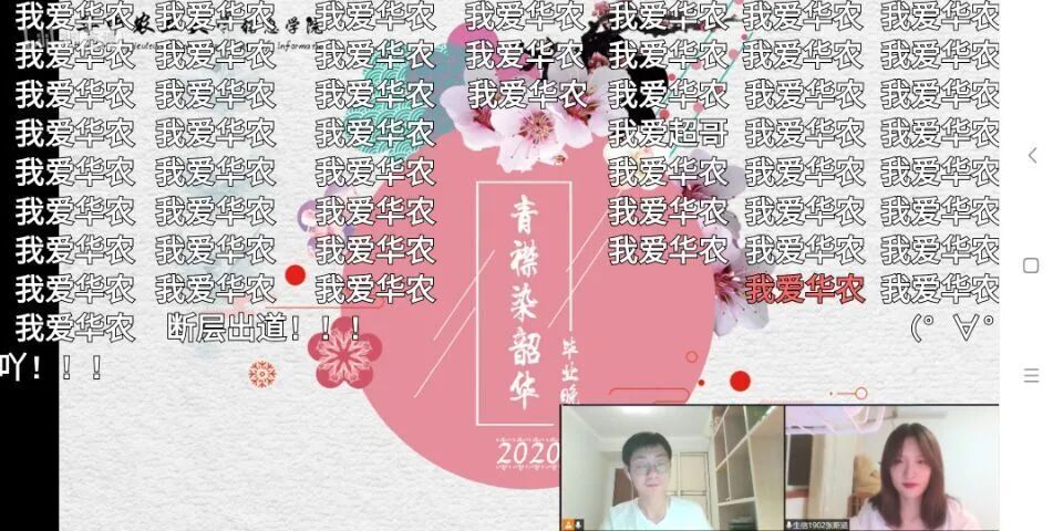晚会以“青襟染韶华”为主题,分为“科研篇”“抗疫篇”“华农篇”“未来篇”四个篇章。视频《我们的时光》如电影般带领毕业生重温了狮子山下的美好时光;“开始的开始,我们都是孩子”,合唱团用动听的歌声勾起了毕业生大学四年的点滴回忆;集体诗朗诵《因为有你》声情并茂地讲述了抗击新冠疫情的感人故事; “如果表情包会说话”将一大波令人捧腹的表情包串联起来,以欢乐的方式为毕业生们减去几分离别的伤感;毕业生宅家自制“荟园同款酱香饼”Vlog,希望永远不会忘记华农的味道,让华农的味道和精神激励自己朝着梦想前进;舞社同学们用活力四射的动感舞姿嗨翻全场,将晚会推向气氛最高点。